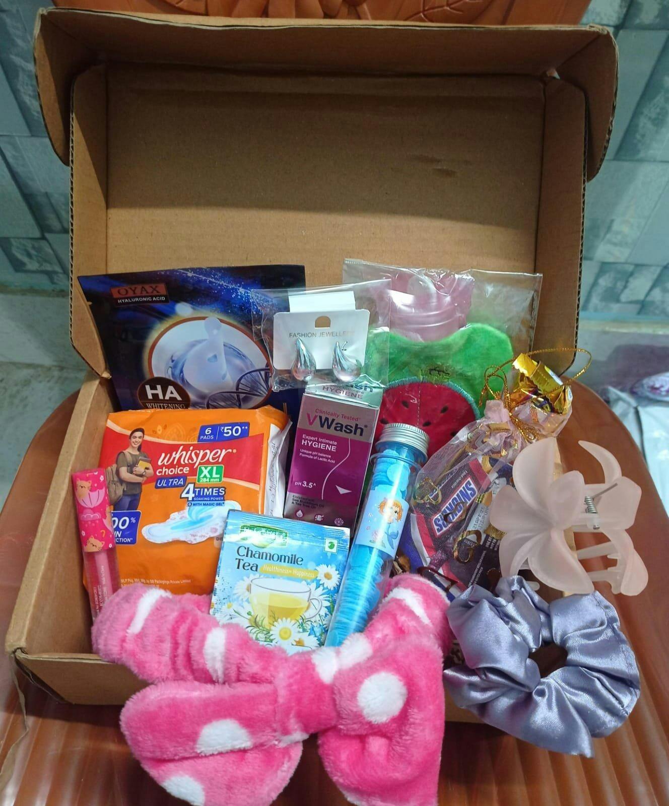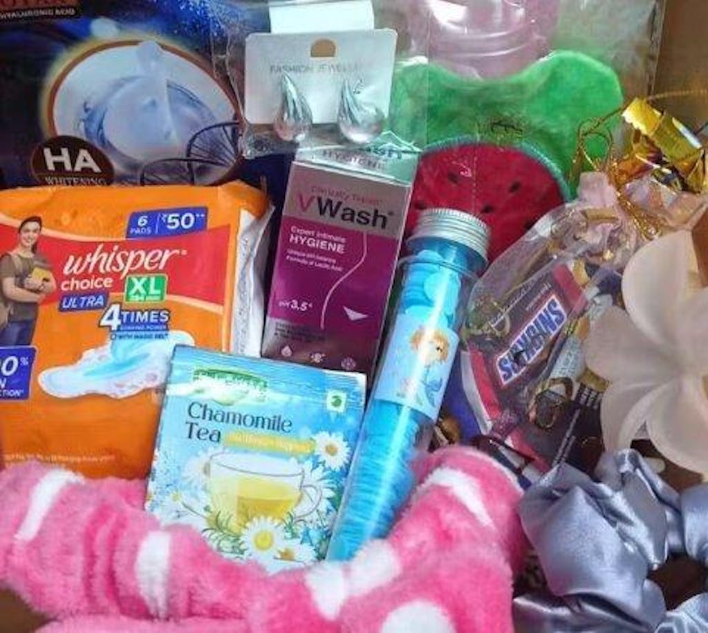 Our kit includes hygiene essentials (like sanitary pads, v wash), pamper items (lip gloss face mask, earrings, etc.), chocolates, and a personalized message card. Each box is thoughtfully curated to bring comfort during that time of the month.
